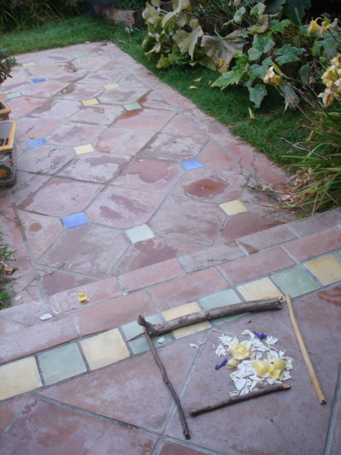 Upon coming back into the house Sarah proudly informed us that she had made a “garden” on the front step (see picture). We went out to have a look, and, sure enough, she had gathered various flower petals and arranged them in a neat pile, surrounded by carefully chosen twigs, on the stone tiles in front of our door.